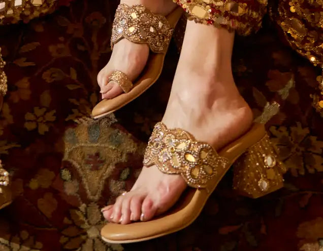 Explore the charm of traditional Indian footwear with our designer women's sandals. Each pair is meticulously crafted to capture the essence of ethnic elegance. Adorned with intricate details and premium materials, these sandals offer comfort and style for every occasion. Step out in style and grace with our collection of premium handcrafted sandals.