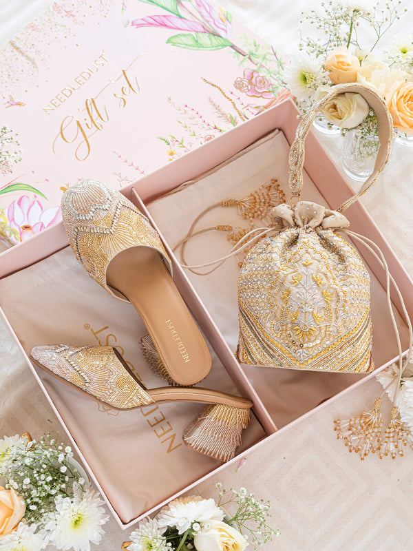 On Friendship Day, express your love and appreciation for your bestie with a special gift sets that combines fashion and friendship. Our exclusive Heel and Purse Gift Set is designed to make your friend feel extra special and stylish. The set includes a stunning pair of heels that will add a touch of elegance to any outfit, along with a designer ethnic purse that is both functional and fashionable. Our collection offers a variety of styles to suit her taste. With this thoughtful gift set, you're not just giving a heel and purse, but a symbol of your friendship and support. Let your friend step into Friendship Day with confidence and style, knowing that she has a special place in your heart.