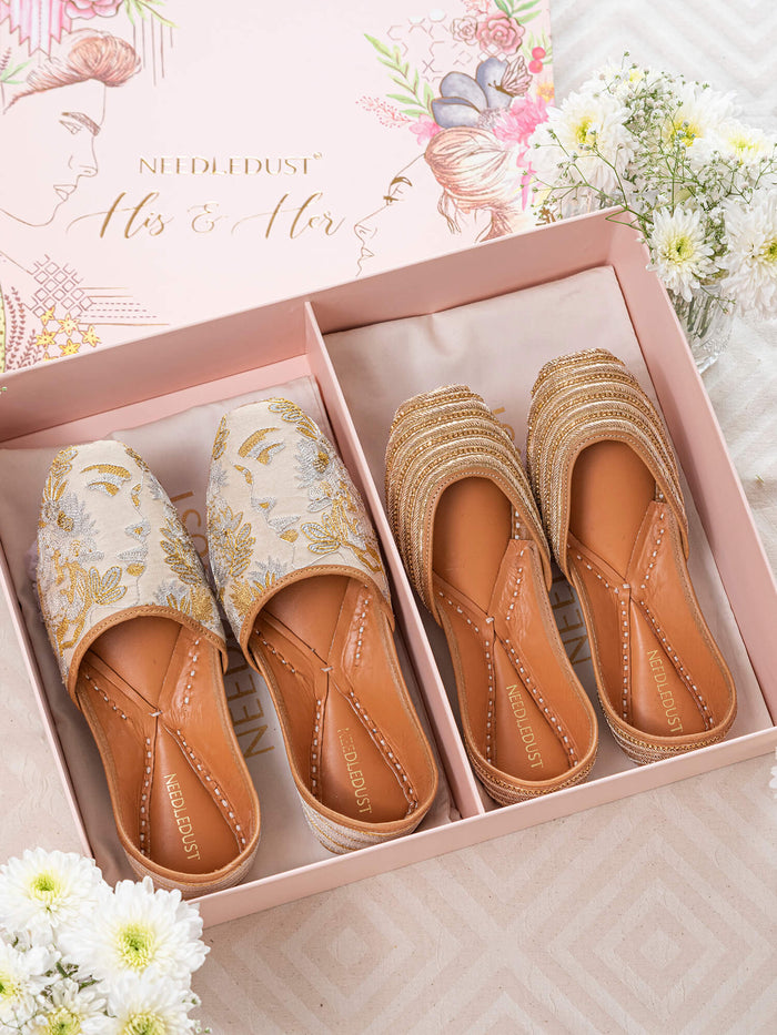 Friendship Day is a time to express your love and appreciation for your friends, and what better way to do that than with stylish and comfortable juttis? We present a delightful collection of Friendship Day special his & her gift set that are designed to make every step with your friends memorable. These Luxury juttis are crafted with utmost care, using high-quality materials to ensure both style and comfort. Whether you're strolling through the park, enjoying a cup of coffee, or dancing the night away, these juttis will be your perfect companion. So, on this special day, surprise your friends with these unique juttis that symbolise your bond and make them feel cherished. Celebrate Friendship Day in style with Needledust Friendship Day Special juttis and create lasting memories with your dear friends.