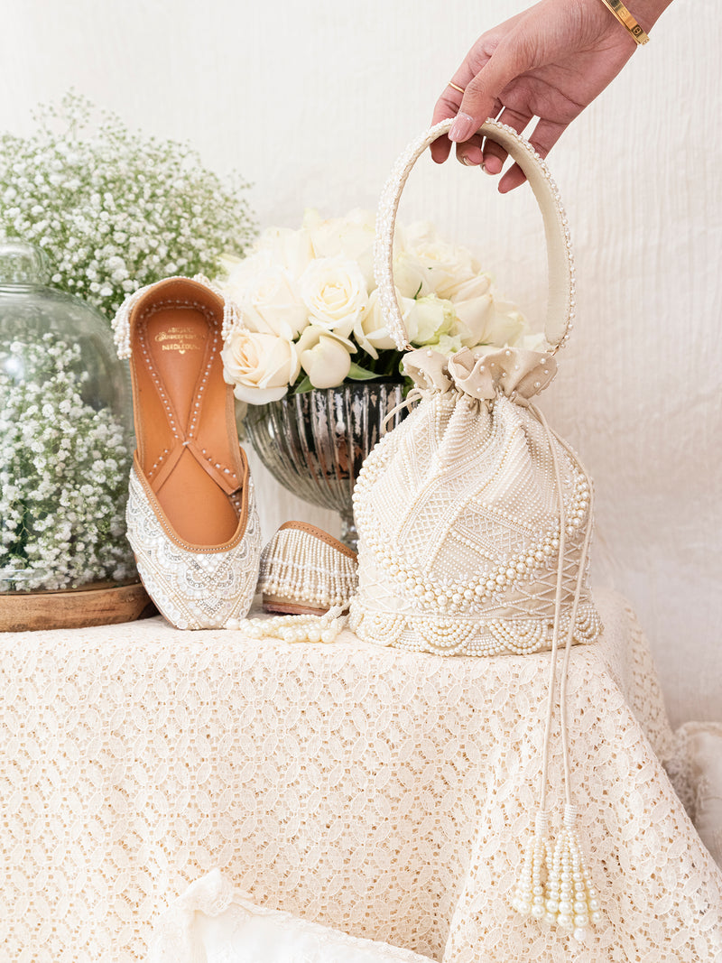 An elegant all-pearl ivory audrey wedding potli bag, handcrafted with high-grade imitation pearls and beads, offers a touch of classic charm. The design features a dangling scallop of various pearl sizes at the bottom, creating a subtle chandelier effect. With drawstrings finished with a bunch of graded pearls, designer purse helps you feel both classy and traditional. As a wedding potli bag, it beautifully complements any bridal look and makes a thoughtful gift. Each potlis for wedding comes with a detachable metal chain and a soft dust bag, blending style and practicality for the special day.