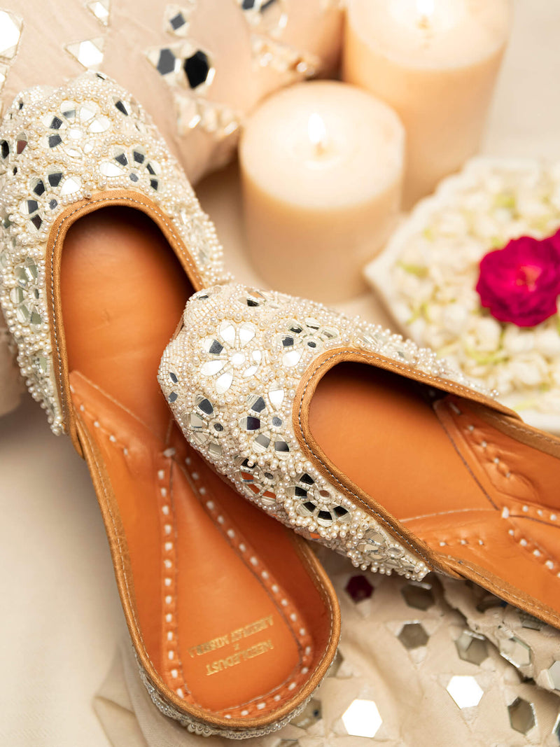 Step up your Navratri game with the exquisite Moti Bagh jutti, the perfect addition to your traditional outfit for Garba night. ivory Designer juttis features a stunning mirror floral pattern, intricately detailed with elegant pearl work, creating a luxurious yet subtle look. The unique design is further enhanced by delicate pearl scallops and small mirrors that add a hint of sparkle and drama to your ensemble. Whether you're twirling on the dance floor or simply enjoying the festivities, Punjabi jutti is your go-to choice for a graceful and stylish Navratri.