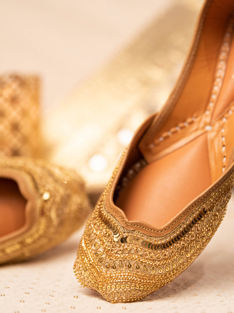Glamorous, sparkling, and a favorite for festive occasions, this mehfil designer jutti features a deep gold base adorned with an opulent zardozi mirror jaal. The exquisite detailing, highlighted with intricate gold threads and champagne sequins, creates a stunning effect that radiates elegance and tradition. Ideal for Navratri and garba nights, this versatile Traditional juttis not only enhances your festive attire but also adds a touch of timeless charm. Whether you're dancing at a lively garba event or attending a traditional gathering, designer juttis is a perfect choice to complement your look and celebrate in style.