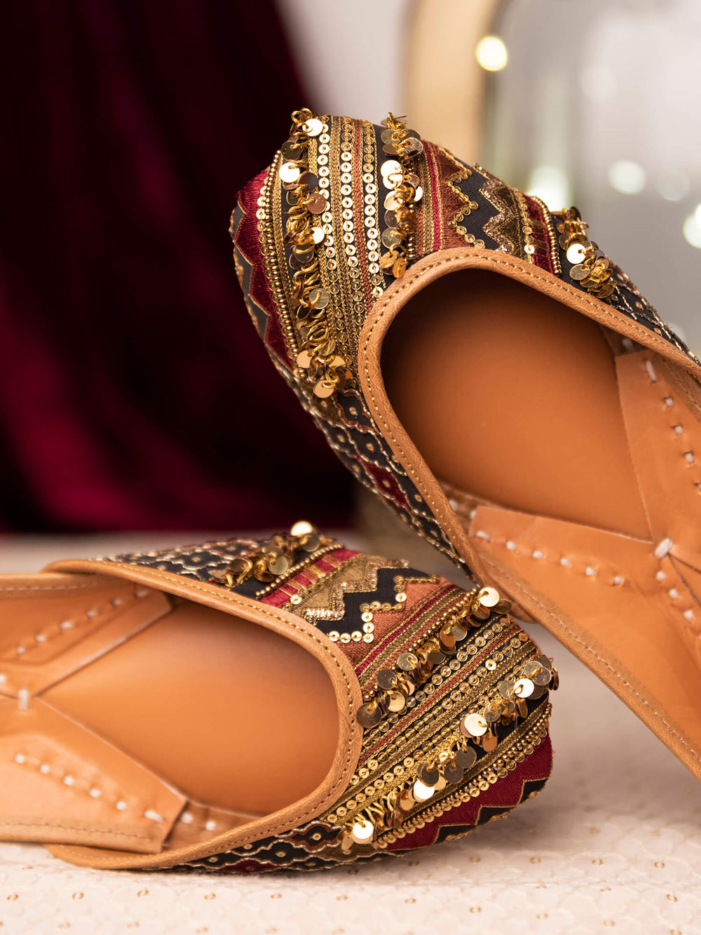 Designer juttis are perfect for those who love unique detailing and modern touches while staying rooted in tradition. Crafted with mirror work, sequins, and chic patterns, these designer juttis uplift your Navratri outfits instantly. Pair them with a heavily embellished lehenga or a flowy Indo-western skirt, and you’re ready for the dance floor.