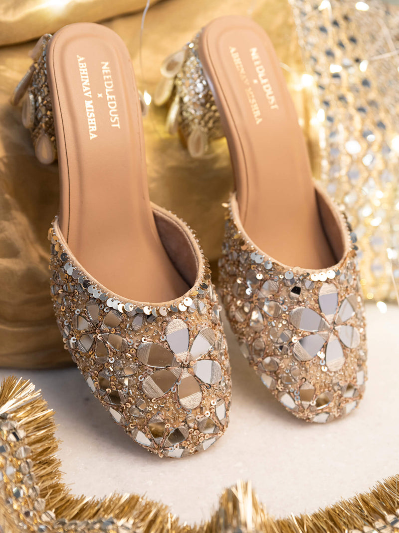 Unleash your inner fashionista and make a striking impression with Needle Dust's stunning collection of mirrorwork juttis. Renowned for their captivating designs and exquisite craftsmanship, these juttis feature intricate mirrorwork that adds a touch of allure and intrigue to any outfit. The play of light and reflection creates a mesmerizing effect that instantly draws attention and sets you apart from the crowd. Whether you're attending a cultural event, a festive gathering, or a chic brunch with friends, Needle Dust's mirror work juttis are guaranteed to reflect your unique personality and impeccable sense of style. Pair them with a simple kurta for a traditional look or a chic jumpsuit for a modern twist, and let your footwear do all the talking.