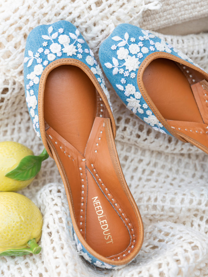 Meet your go-to summer footwear: Needledust's "Matilda Jutti." Effortlessly slip into these juttis with your favorite pair of denim and a crisp white poplin shirt for a casual yet chic look. But don't let its simplicity fool you – the Matilda Casual Jutti is also the perfect accessory to elevate your staple white kurti for summer. Crafted on a washed blue denim base, adorned with 3D ivory florals and high-grade pearls, this jutti tells the story of a blooming spring garden. Whether you're running errands or attending a summer gathering, step into style with the Matilda Jutti and effortlessly transition from basic to chic.