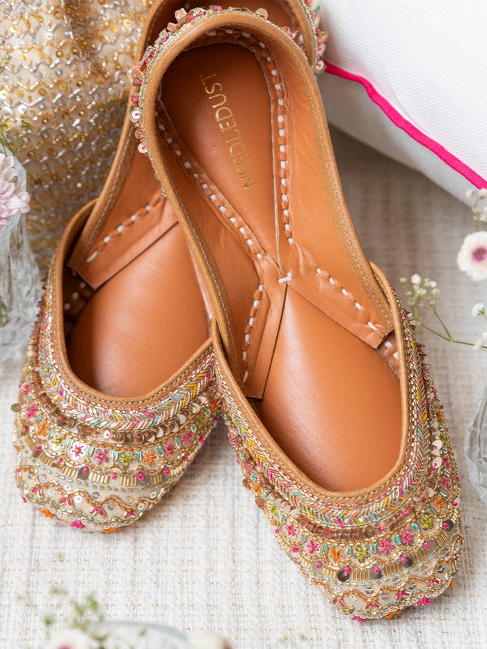 Celebrate summer in style with Needledust's "Rabee Jutti." This elegant creation features delicate pastel hues and champagne sparkles, perfect for adding a touch of sophistication to your ensemble. Inspired by intricate Persian jaali design, this pastel jutti showcases artisanal excellence with subtle florals hand-embroidered with resham thread work and sequins. Whether it's a daytime event or an evening soiree, elevate your summer look with Needledust's Rabee Jutti, and let your style shine bright all season long.
