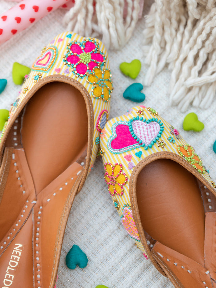 Add a pop of fun to your summer outfits with Needledust's "Rose gold Jutti." Featuring a white and yellow pin stripe base adorned with eclectic retro hearts and blooming flowers, this Ethnic jutti exudes playful charm. Bright blues, pinks, yellow, and lavender with gold and silver metal accents create a vibrant palette, while cute stuffed nano hearts dangling at the back spark conversations. A summer must-have, the Rossi Jutti brings joy and excitement to any occasion.