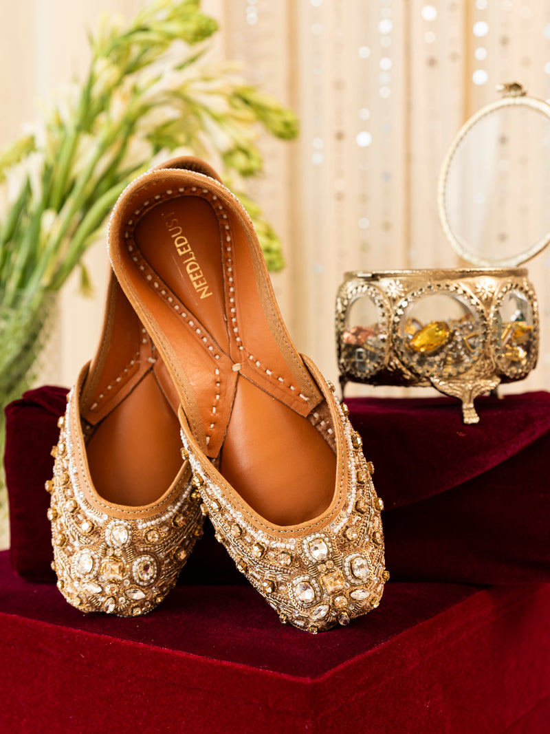 The Marquise jutti & purse pairing is a celebration of regal bridal beauty. Designed for brides who love timeless grandeur, this set complements traditional wedding lehengas adorned with heavy embroidery, rich textures, and layered detailing. The refined finish of both the jutti and purse adds luxury without overpowering the bridal outfit, making it ideal for bridal entry moments, wedding portraits, and ceremonial celebrations.