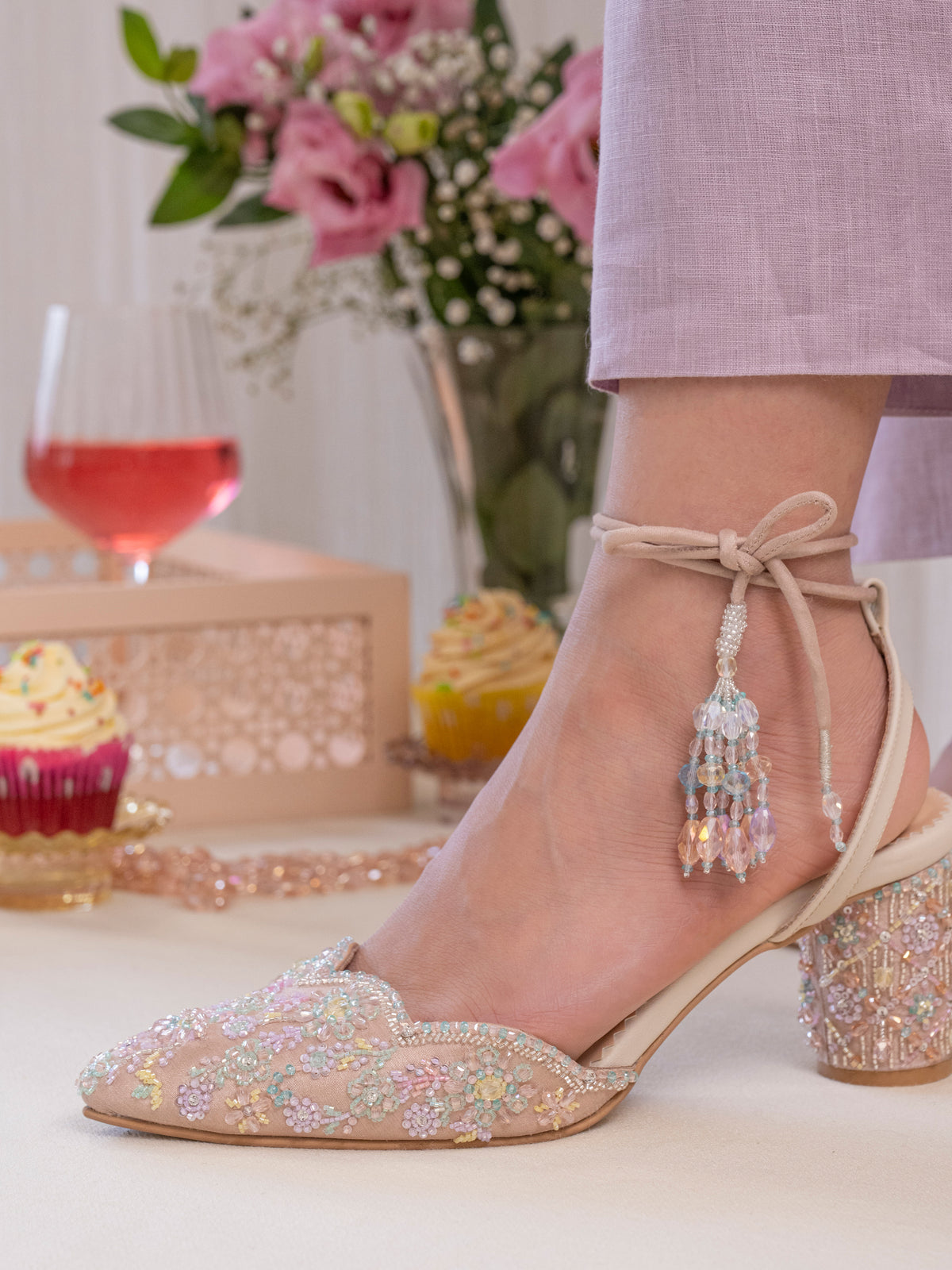 Mirror-work jutti heels pair beautifully with shararas or palazzos at pre-wedding outdoor functions.