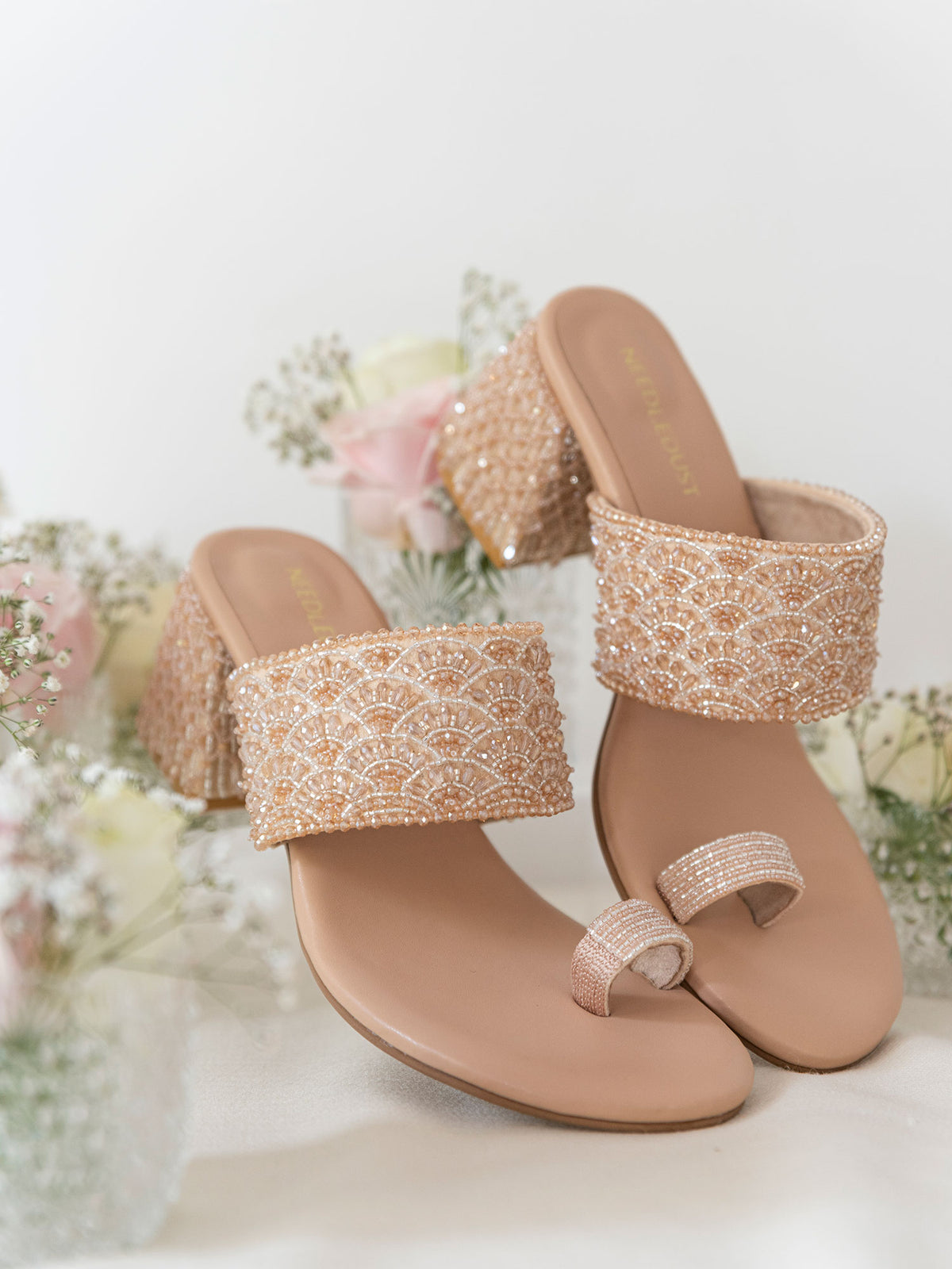 Bridal block heels for wedding are the perfect choice for outdoor events that require support and style. Their wider base distributes weight evenly, making them ideal for long hours on grass, sand, or stone pathways. These designer wedding heels also come in embroidered, pearl-studded, or pastel shades that complement lehengas, sarees, and gowns effortlessly.