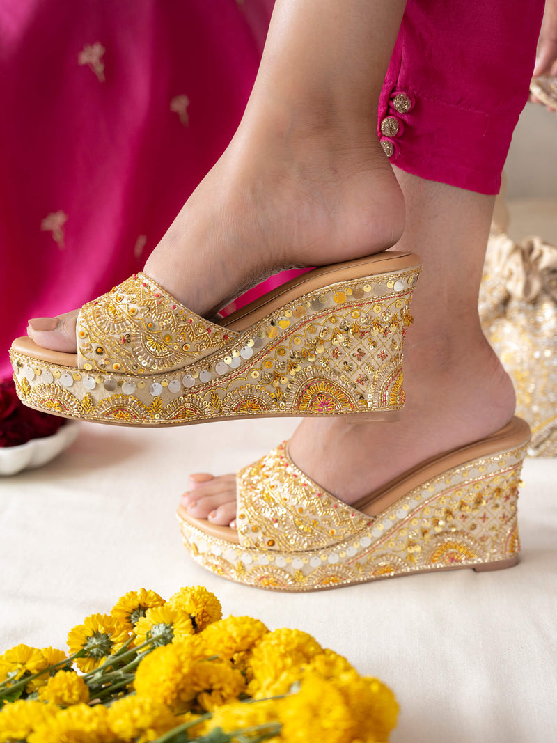 Golden bridal heels are a timeless choice, adding a royal and luxurious feel to any bridal outfit. These gold wedge heels for wedding beautifully complement traditional Indian wedding attire, such as lehengas and sarees, enhancing the richness of gold embroidery and embellishments. Golden bridal heels can easily match a variety of colors and styles, making them a versatile option for brides. Whether it's a daytime or evening wedding, golden heels ensure you stand out with elegance. Their regal shine helps every bride feel like royalty on her special day, making them a top pick for bridal footwear.
