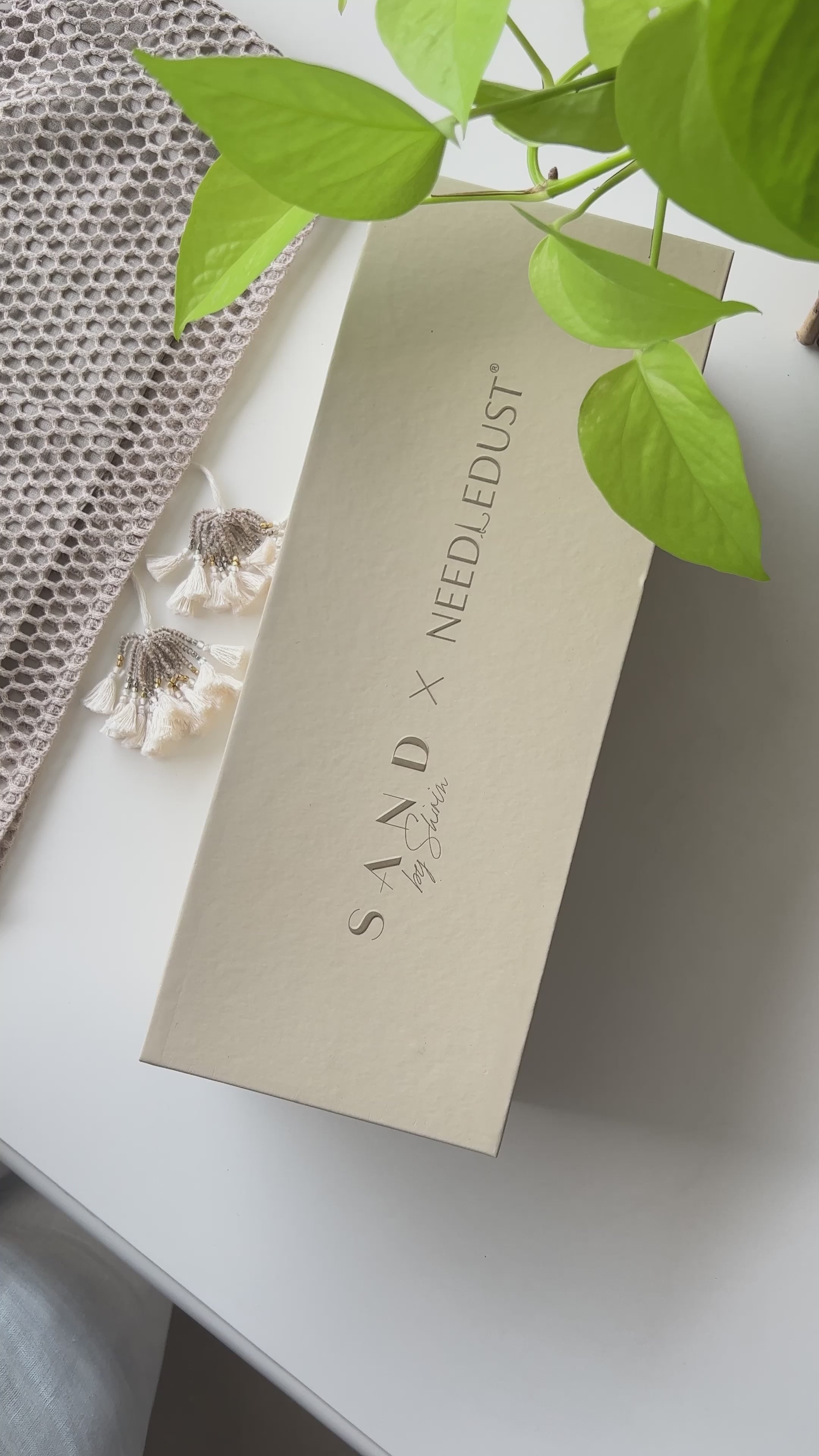 A brand new criss cross strap silhouette with handcrafted macrame laces made using natural colour dyed cotton strings, amped with ivory and sand glass beads with tassel lace details.