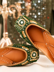 A bold blend of boho charm and luxe detailing, this jutti is crafted on a rich, deep red silk base with hand-done mirror work, metallic gold and silver coins, and charms. The front features a striking mirror medallion framed with metallic accents, while the sides and back are adorned with cascading thread tassels and fringes, adding movement and drama. Perfect for festive evenings, mehndi celebrations, or styled with colourful lehengas, kaftans, or contemporary boho looks, this pair makes a stunning statement- luxurious yet free-spirited.