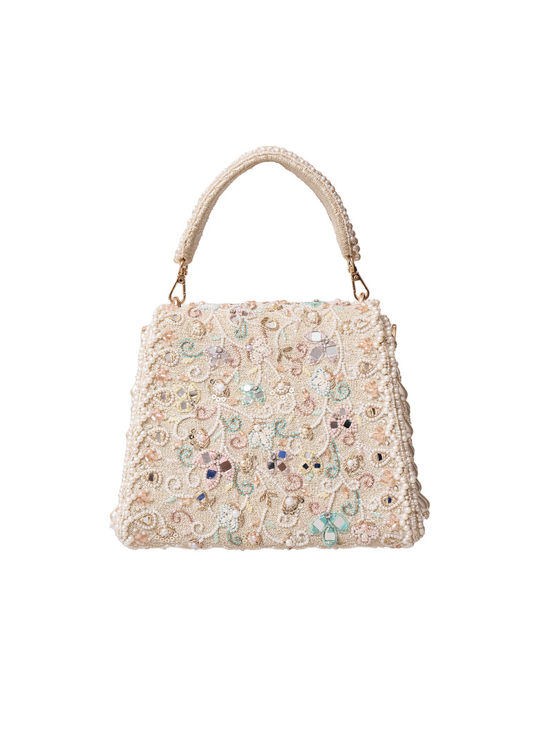 SPECIAL EDITION! A new style, silhouette and structure redefining the essential purse of the season! Inspired by the idea of contemporary royalty that dabbles with our rich heritage of handicraft, comes an elegant ivory structured purse. Handcrafted in high grade polished imitation pearls and crystals in pastels with dews of mirrors floating in silk threads! The elegant purse is a head turner, with side panels and front flap adorned with dew pearl tassels dancing in subtle motions! This three way purse comes with a gold chain, a top handle as well as our all new cross body strap densely embroidered with dew shaped pearls tassels on an ivory, champagne embroidered base. All three straps are futher detachable for your convenience! Wear it with your lehengas or sarees and or make it a statement on an elegant cocktail dress!